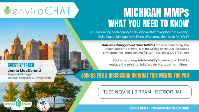 enviroCHAT is an event where EMA members and allies come together for discussion with representatives from EGLE & other industry specialists on important environmental hot topicsin the name of news, networking, and community. Past events include discussions on Lithium-Ion Battery Safety & Response, Release Reporting, PFAS as an Emerging Pollutant in Water, and Industrial Storm Water Compliance.